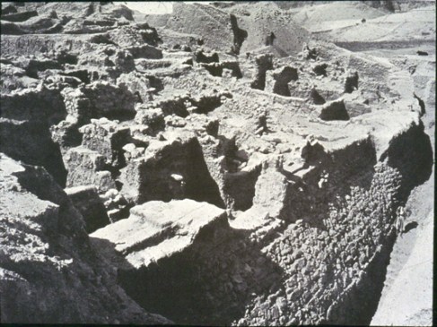 Picture of ancient Jericho showing the excavations by Sellin and Watzinger (they excavated in 1907-1909, 1911). It shows Jericho’s revetment wall of uncut stones (bottom right next to the man), a thick mud brick wall on top of the revetment wall, and some of the ruins of the buildings inside the city (on the left).